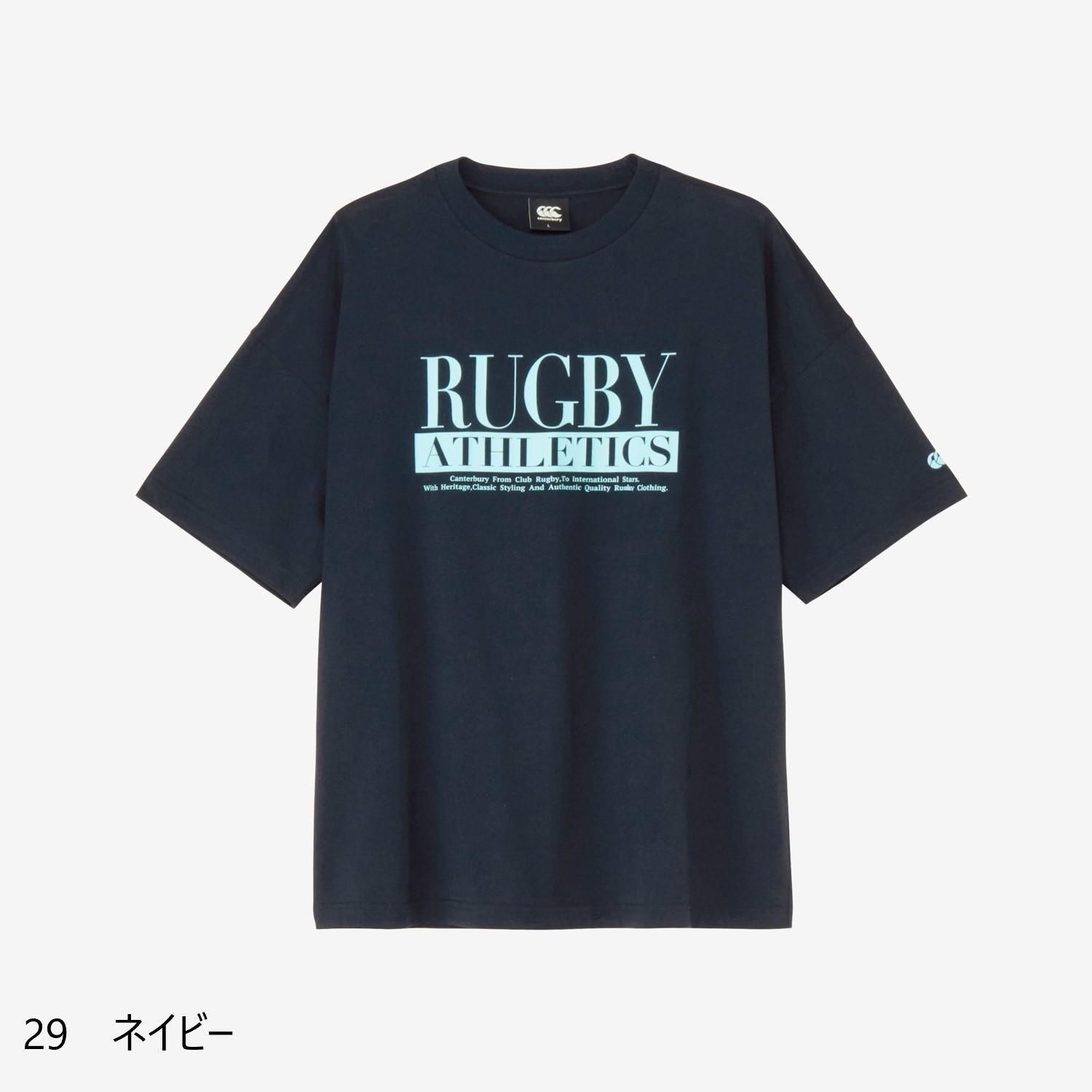 シルエットは、身幅やアームホールに余裕を持たせたボックスタイプで、「RUGBY ATHLETICS」をテーマに、ブランドロゴやタグラインを配したデザインになっています。